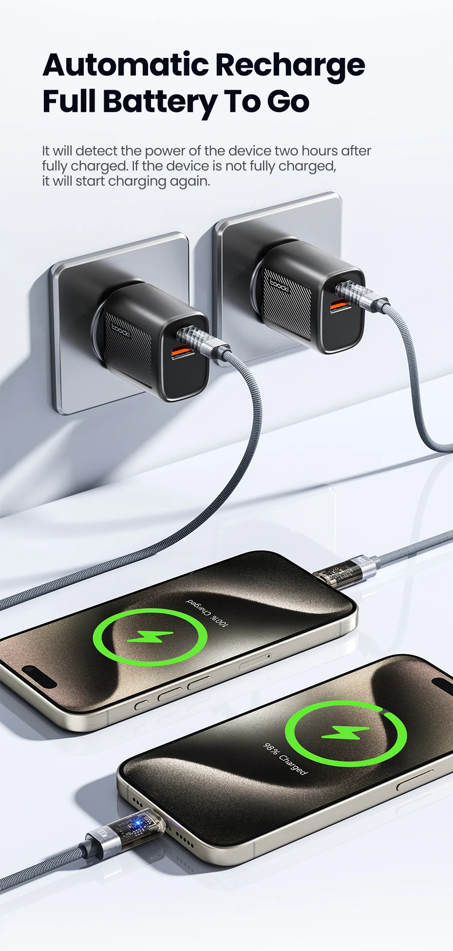 The cable features a transparent connector design for a premium, modern look, while the braided nylon construction ensures resistance against tangling, fraying, and daily wear. If you’re using an iPhone 16 or iPhone 17 Pro Max, this cable fully supports fast PD charging when paired with a compatible charger.